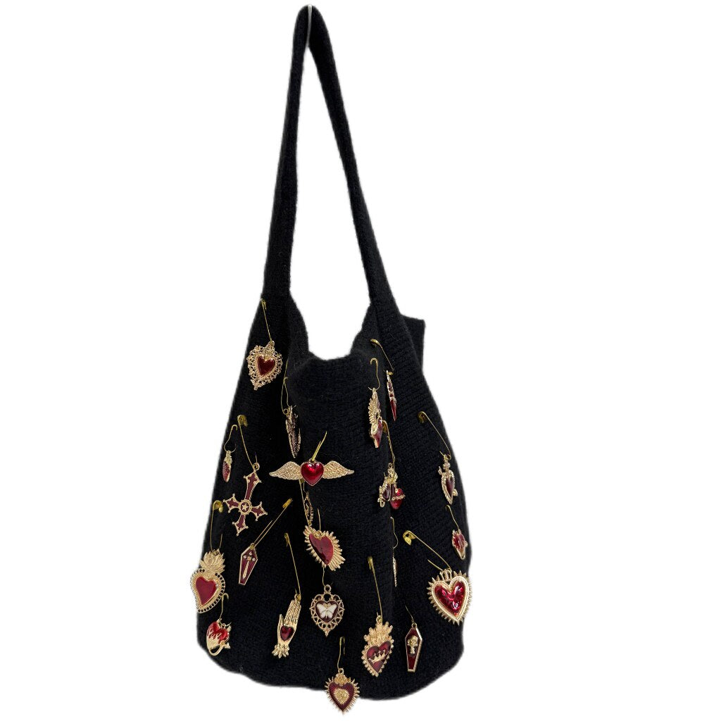 Original Gothic Punk Knit Bag with Charms | Y2K Grunge & Alt-Fashion Shoulder Bag for Women